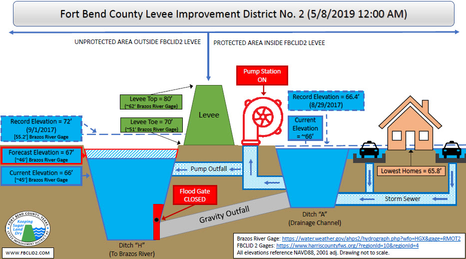 The Brazos River is forecasted to crest on Friday, May 10th near FBCLID2. The forecasted water elevation in Ditch H created by the Brazos River will remain 2-3 feet below the bottom of the FBCLID2 levee. However, additional rainfall is still forecasted through the weekend and all rainfall runoff must be pumped out of the levee. FBCLID 2 will continue to operate the pump station at full capacity throughout the duration of this event.